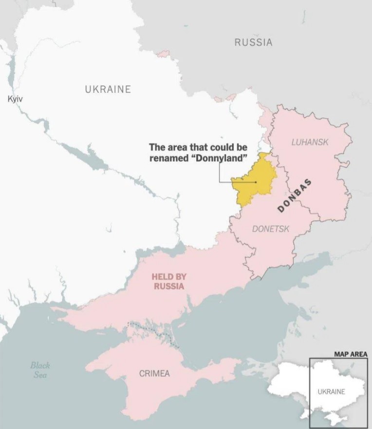 Но, најневеројатниот пример за тоа името на претседателот Доналд Трамп да биде позајмено на геополитичка жариште може да биде оној што останал надвор од јавноста досега. Во мировните разговори за Украина во последните месеци, украинските претставници сугерираа дека делот од регионот Донбас во земјата за кој Русија сè уште се бори може да се нарече „Дониленд“, „Њујорк тајмс“.