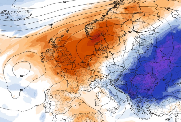 До средината на неделата, антициклонот над Северниот Атлантик дополнително ќе се зајакне и ќе се прошири сè до Гренланд, што ќе го турка студениот воздух подалеку на југ, кон Централна Европа и Балканскиот Полуостров. Температурната аномалија ќе биде изразена, со вредности до 12°C под нормалата во многу земји од Источна Европа. Постепеното заладување во среда ќе влијае и на делови од Централна Европа, вклучувајќи го и Балканот.